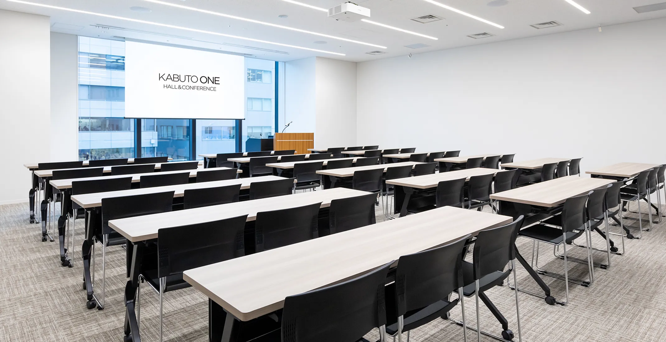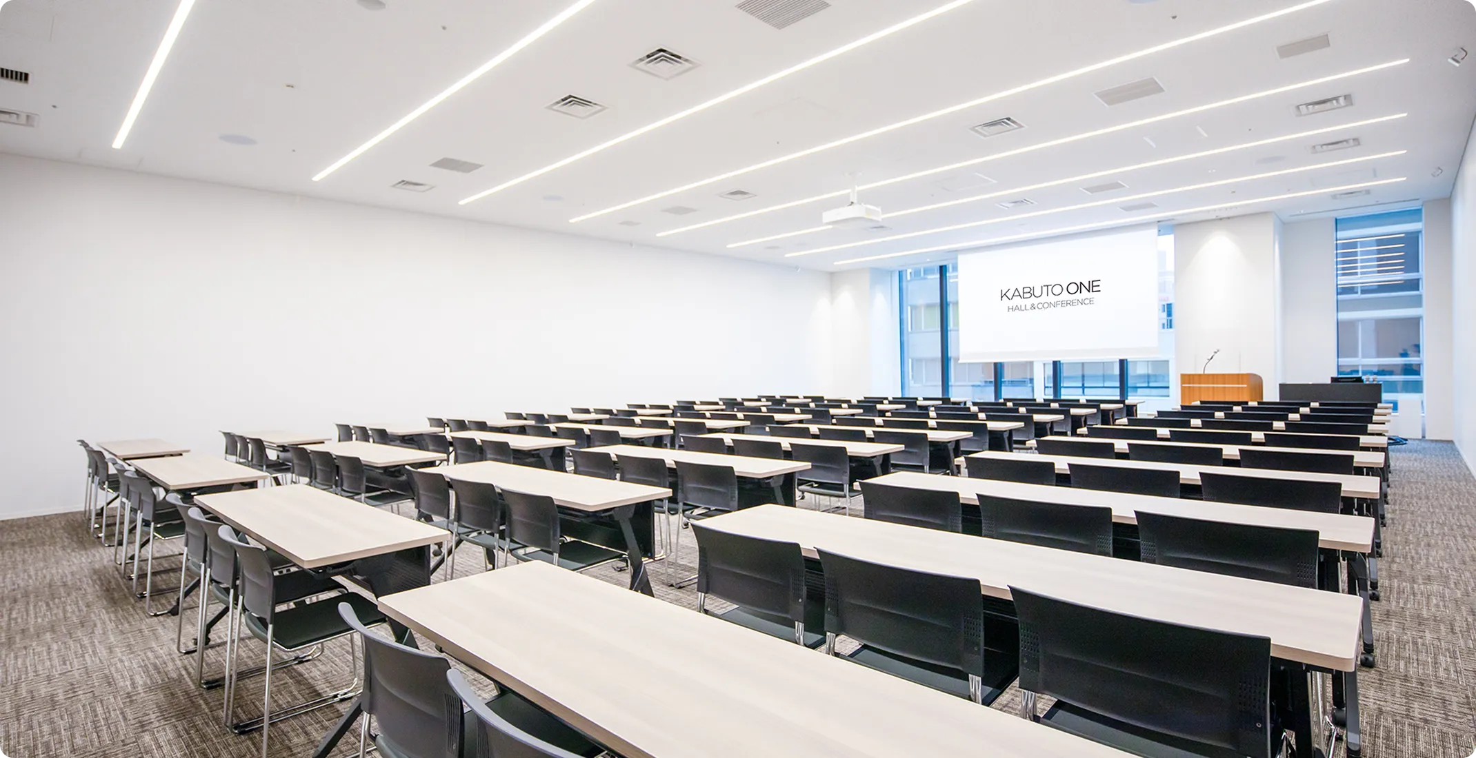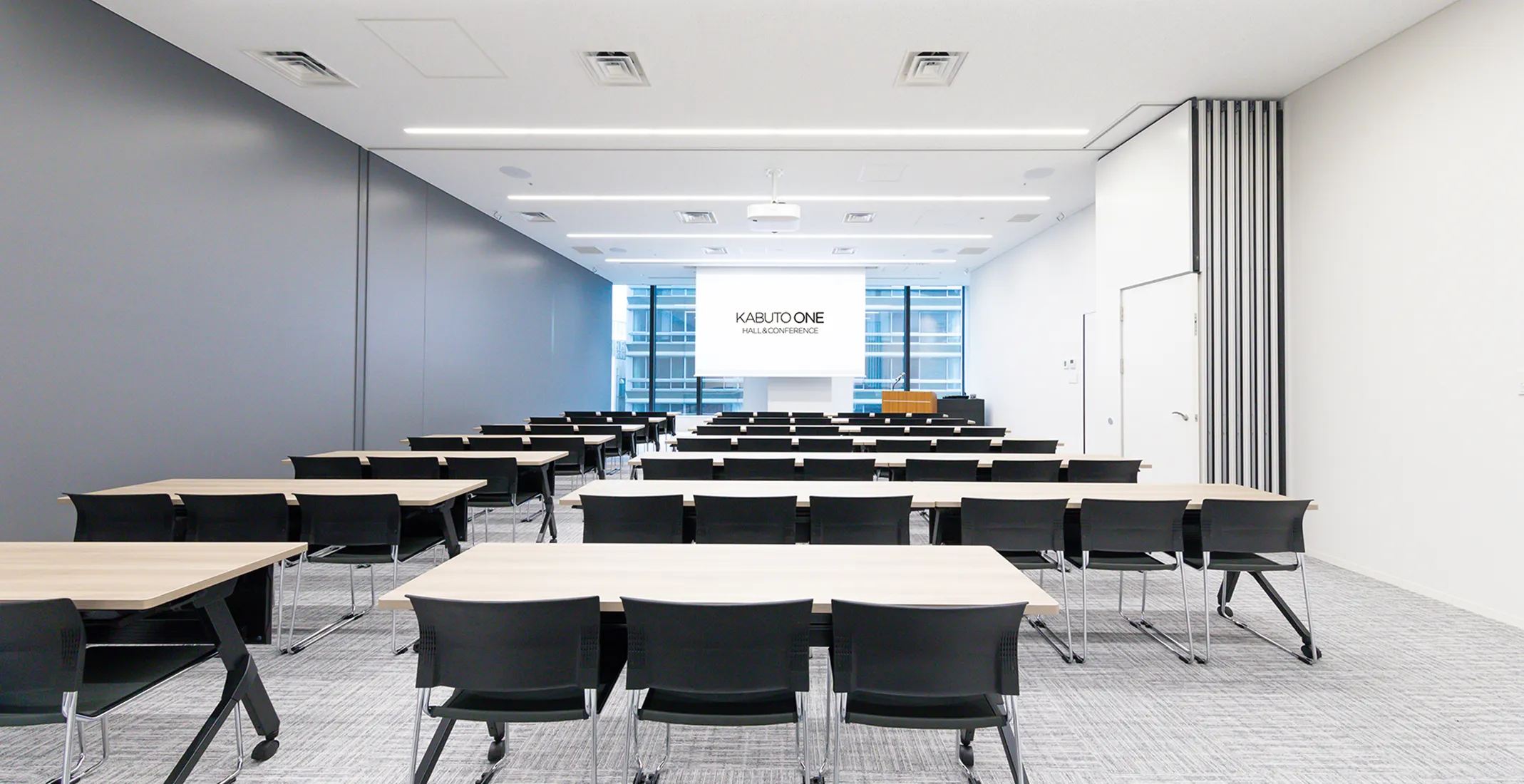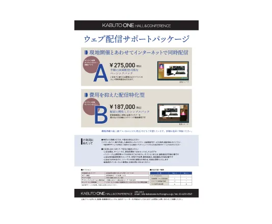 プロジェクター、ワイヤレスマイク、講演台、司会台、65インチモニター、受付台 (会場延長利用あり)
