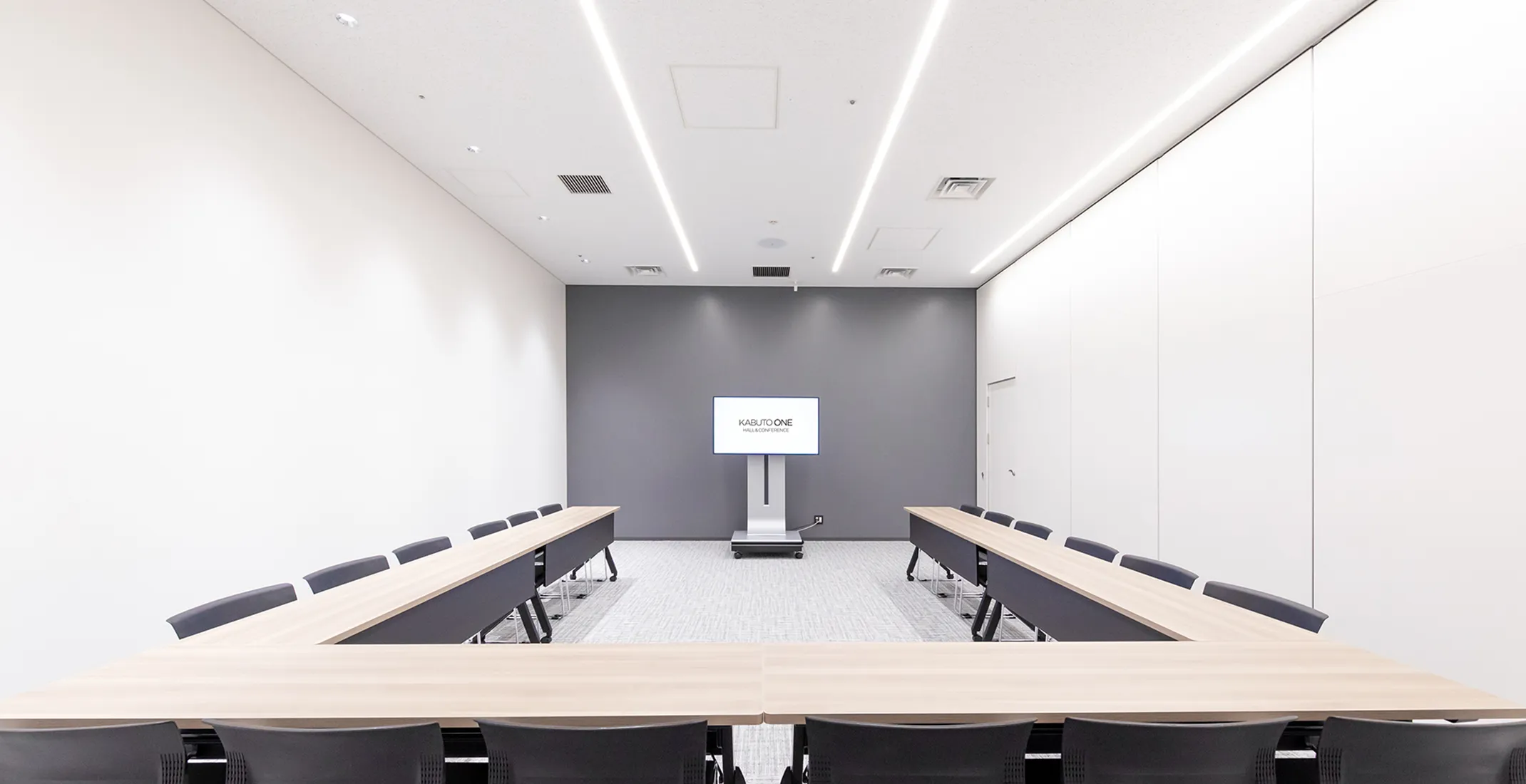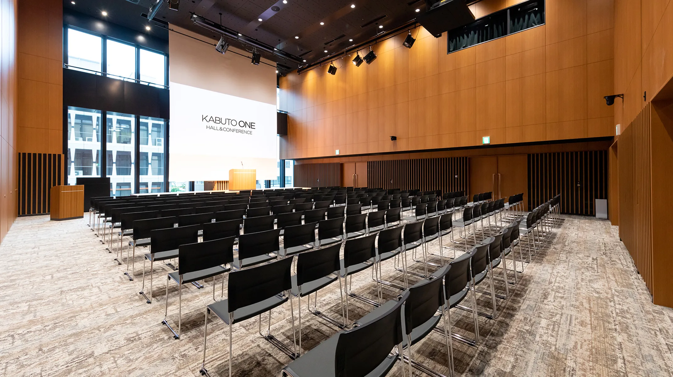 落ち着きのある木目調の壁と空間を引き締めるモノトーンの天井で、ハイグレードな設えがイベントの成功のサポートをします。